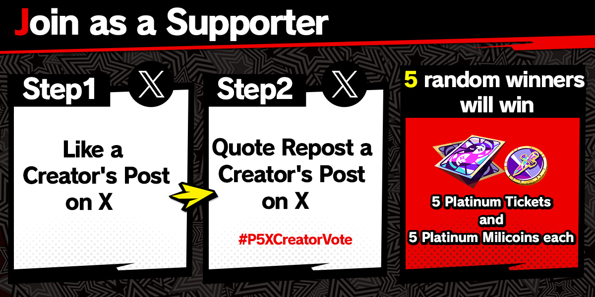 Quote Repost the Post of the Creator you want to support on X.In your Quote Repost, include your comments and what you think about the video, and add the hashtag #P5XCreatorVote to enter.